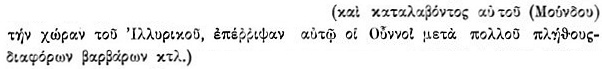 7. Ennodius, c. XII, ibid., p. 210—211, като разказва, че Сирмиум бил завзет от Теодориховия пълководец Пиций, продължава: quibus (Pitzia exercituque eius) ibi ordinationem moderantibus per foederati Mundonis attrectationem Graecia est professa discordiam secum Vulgares suos in tutela deducendo ...