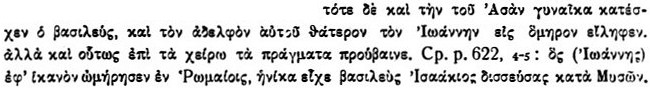 1. Niсеtаs, ib., р. 486, 21—487, 1. — Следъ тоя пасажъ Никита пакъ пише: „Тогава Исаакъ потегли противъ тѣхъ” — възстаницитѣ. Но той и тукъ, както и по-горе (вж. тукъ, стр. 235, бел. 6), отнася първия походъ на Исаака противъ възстаницитѣ веднага следъ нахлуването имъ въ южна България. Обаче още В. Г. Васильевскій, каз. рец., п. т., стр. 187—189), възъ основа речьта на атинския митрополитъ Михаила Акоминатъ, брата на Никита, казана по случай сватбата на Исаака Ангелъ, показа, че първиятъ походъ на последния е станалъ следъ бунта на Алексия Вранà, а пъкъ самиятъ Никита пише (ib. p. 489—491), че бунтътъ на Алексия Вранà избухналъ, следъ като той билъ изпратенъ противъ възстаницитѣ, и че преди това императорътъ изпращалъ противъ сѫщитѣ други двама византийски пълководци, така че Никита и тукъ се явява непоследователенъ въ изложението на факта. Синопсисътъ държи реда на Никита. — Г. Акрополитъ нищо не споменува за първия походъ на Исаака.
